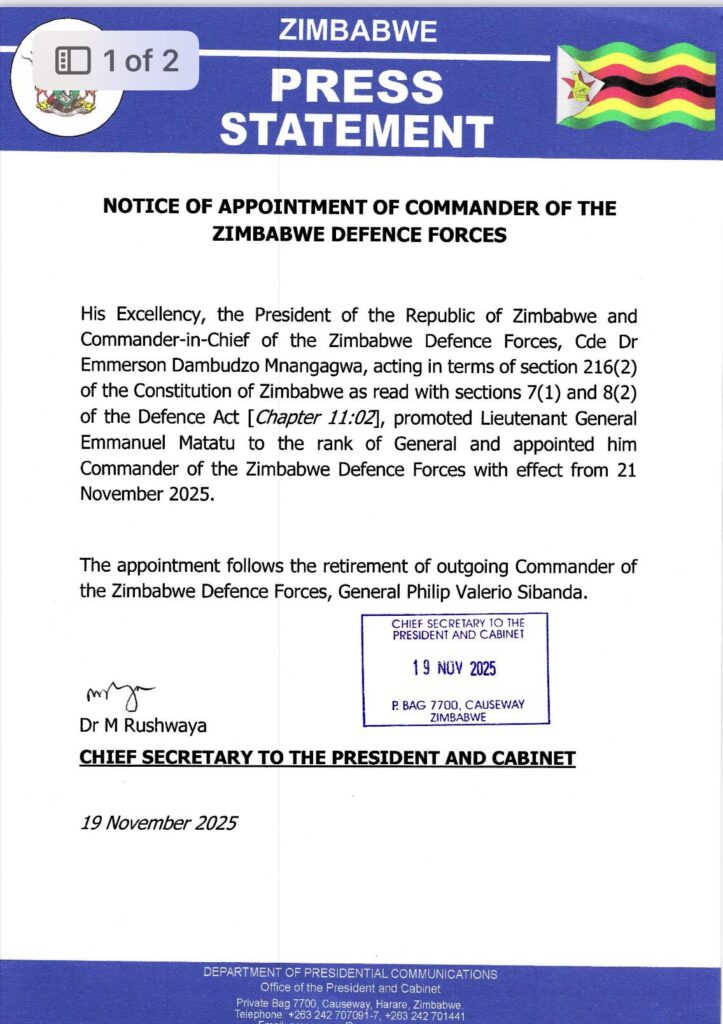 In a widely predicted move that has far-reaching political implications, particularly on the Zanu PF internal succession power struggle and the 2030 political project, President Emmerson Mnangagwa has promoted Lieutenant-General Emmanuel Matatu to the rank of General and appointed him the new Zimbabwe Defence Forces (ZDF) commander with effect 21 November 2025.