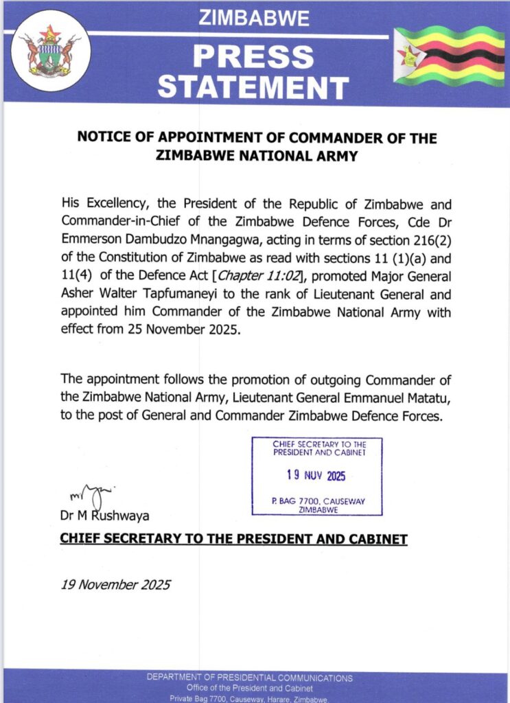 Meanwhile, Mnangagwa also promoted Major-General Asher Walter Tapfumaneyi to the rank of Lieutenant-General and subsequently appointed him Zimbabwe National Army commander with effect from the same date.