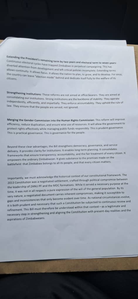 “Zimbabwe’s past elections have too often been marred by violence, contestation, and the refusal by losing candidates to accept outcomes. The bill removes the conditions for such disputes by providing for the election of the President throufh Parliament. It ensures stability. It ensures unity. It ensures that governance continues without interuption. The people deserve certainity. The people deserve peace,” read the letter.