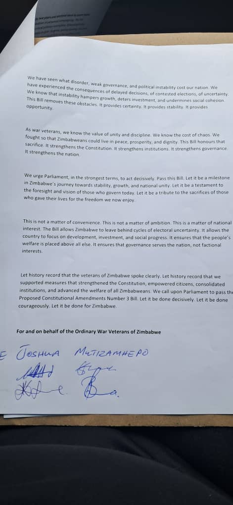 In a letter dated 19 March 2026, ordinary war veterans represented by Joshua Mutizamhepo, have put their weight behind MPs selecting the president and not every Zimbabwean.